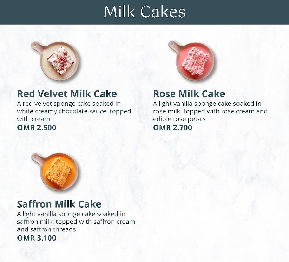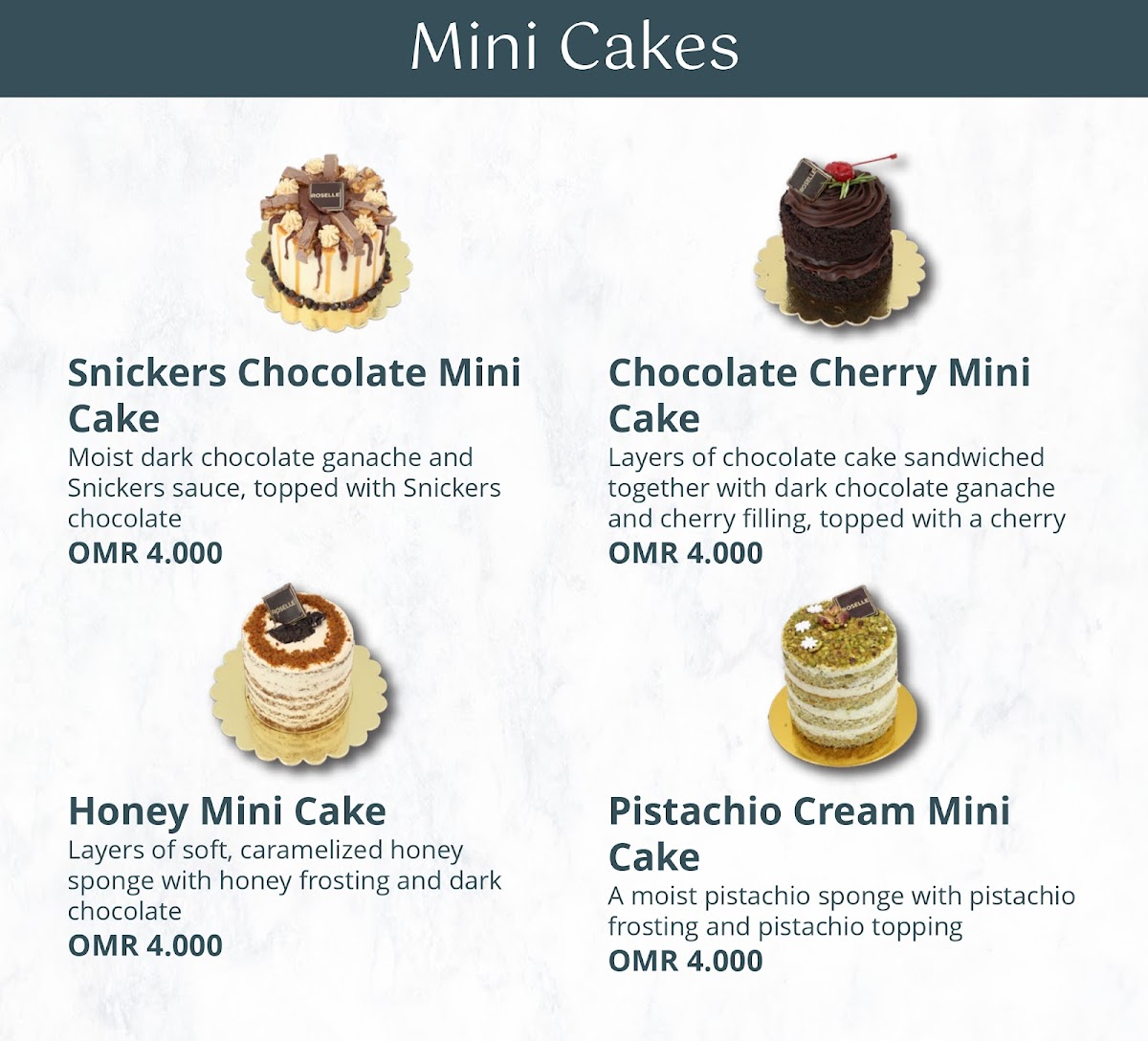 Welcome to Roselle Bakery & Cafe, a delightful café nestled on Al Wilaj St, Muscat, Oman. Here, the aroma of freshly baked cakes and brewed coffee invites you to indulge in a sweet escape. The menu features an array of delectable offerings, with whole cakes like the rich Chocolate Fudge Cake and the fragrant Saffron Cake, both priced at OMR 11.000. For a lighter treat, mini cakes such as the Chocolate Cherry Mini Cake and Pistachio Cream Mini Cake at OMR 4.000 are perfect for a quick indulgence.